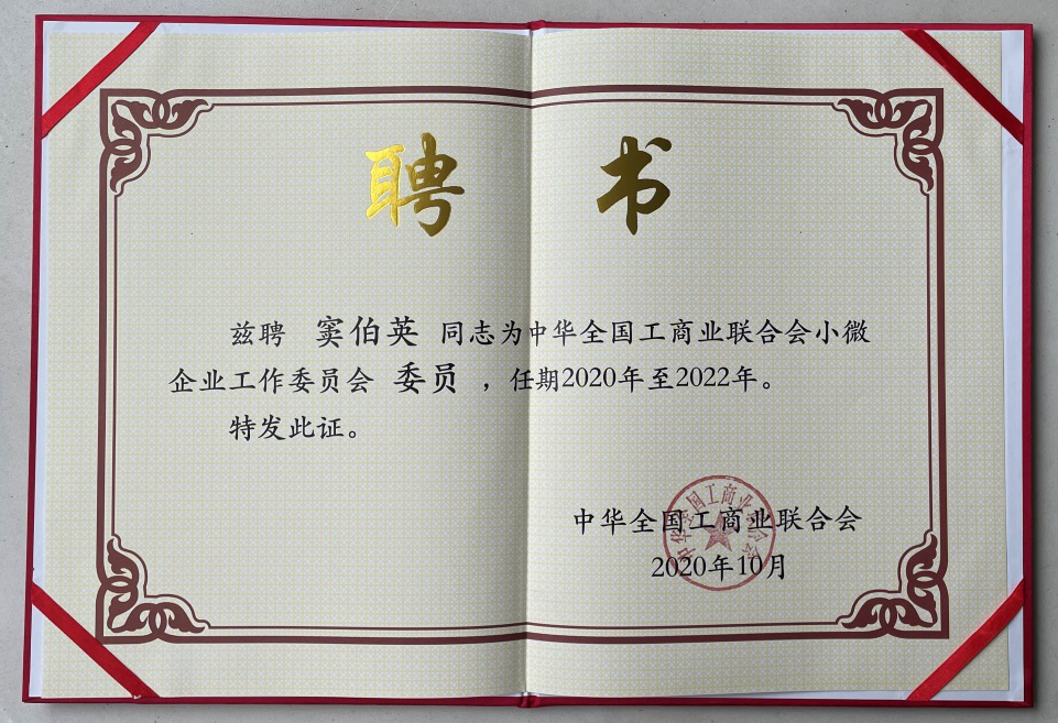 为进一步落实新时代民营经济统战工作的要求,有效扩大统战工作覆盖面,加强与小微企业的联系,积极打通小微企业参政议政的通道,推动改善小微企业发展环境,经中华全国工商业联合会(简称:全国工商联)2020年第10次主席办公会议研究,成立全国工商联小微企业工作委员会,并聘请洛阳猫咪视频官网APP探伤技术有限公司(简称:猫咪视频官网APP公司)CEO窦伯英女士出任中华全国工商业联合会小微企业工作委员会委员。